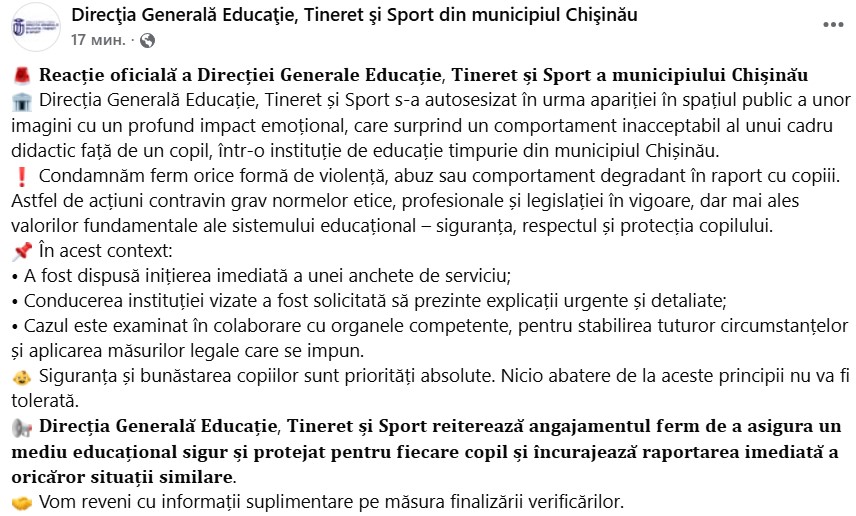 Direcția Generală Educație, Tineret și Sport reiterează angajamentul ferm de a asigura un mediu educațional sigur și protejat pentru fiecare copil și încurajează raportarea imediată a oricăror situații similare”, notează DGETS.