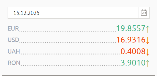 Leul moldovenesc își păstrează stabilitatea la început de săptămână. Banca Națională a Moldovei a stabilit pentru astăzi, 15 decembrie, cursuri de schimb fără variații majore pentru principalele valute, euro și dolarul american rămânând la niveluri apropiate de cele din zilele precedente.