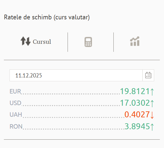 Euro și dolarul continuă să se aprecieze în raport cu leul moldovenesc, potrivit cursului oficial afișat astăzi, 11 decembrie, de Banca Națională a Moldovei.