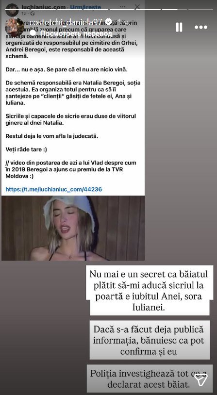 Daniela Costețchi a oferit noi detalii pe marginea dosarului investigat de Poliție, susținând că are dovezi clare despre cine a executat „ordinul”. Persoana indicată este Islam, iubitul Anei Beregoi (sora Iulianei). Daniela susține că tânărul ar fi fost plătit special pentru a transporta sicriul și crucea — pe care era trecută data morții bloggeriței — la casa tatălui acesteia.