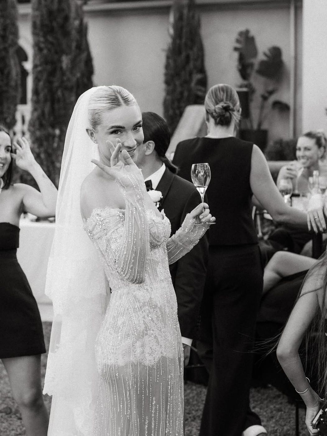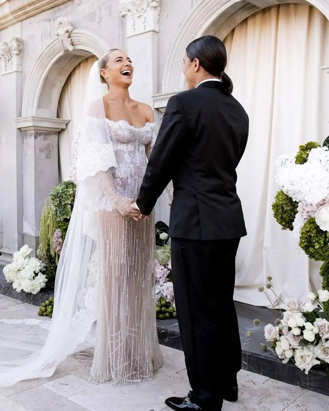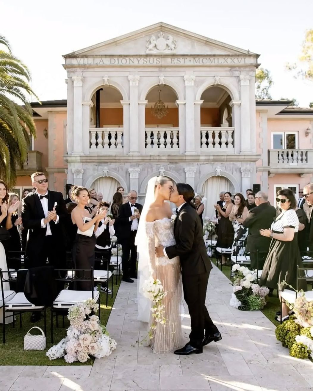 Cuplul a organizat o petrecere impresionantă, iar toți invitații au purtat ținute negre. Jurămintele au fost rostit în curtea din față a vilei Dionysus.
