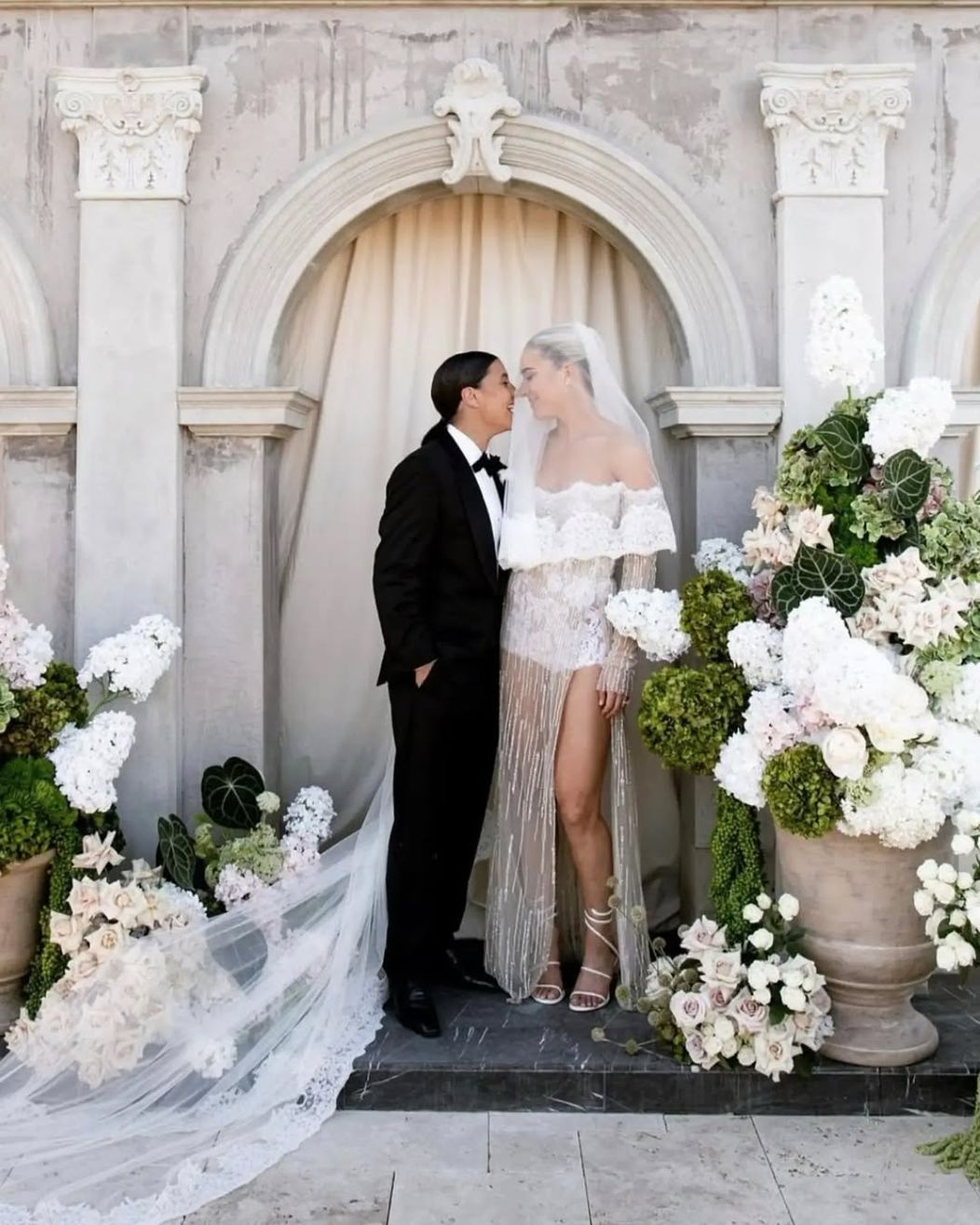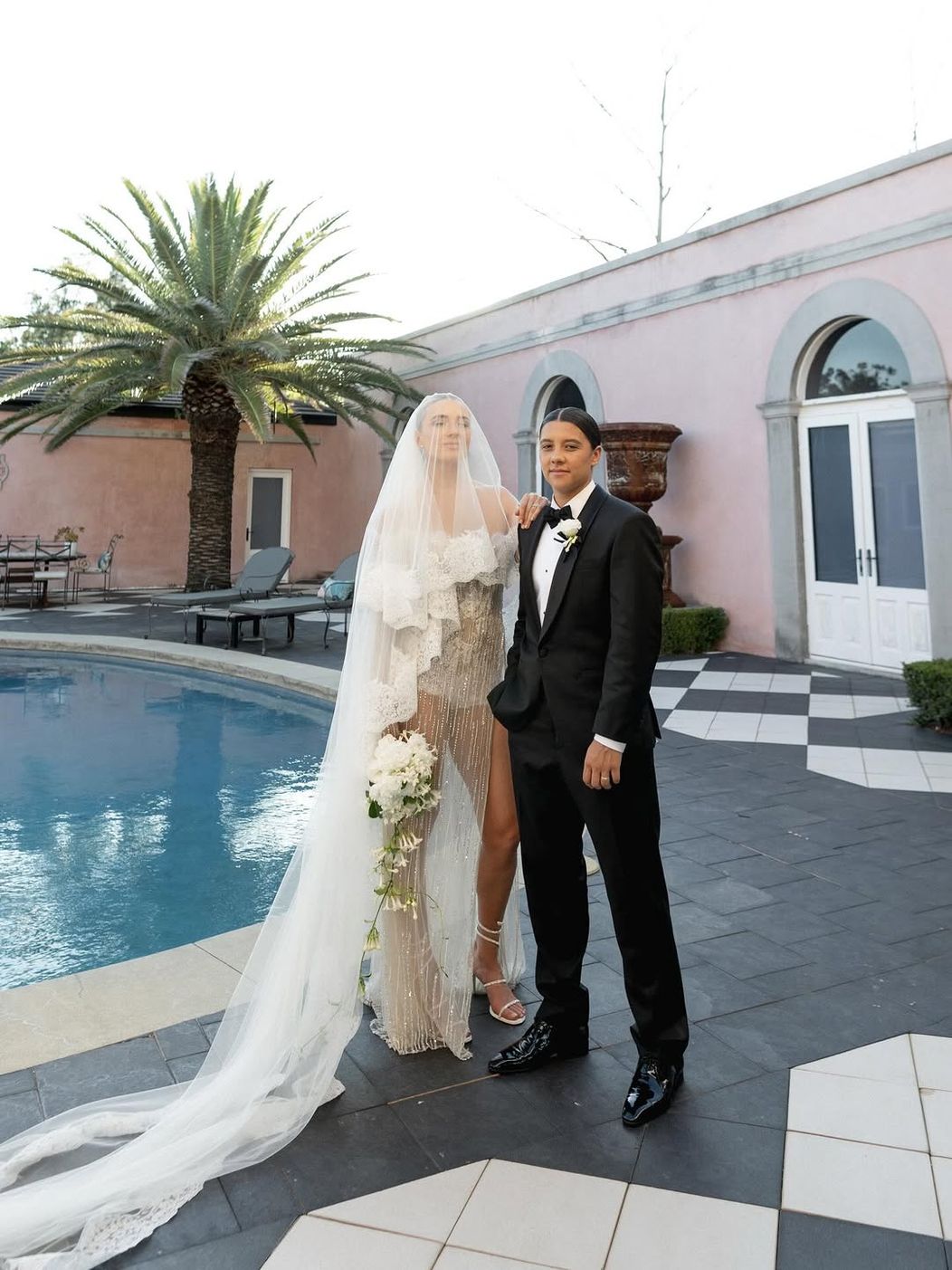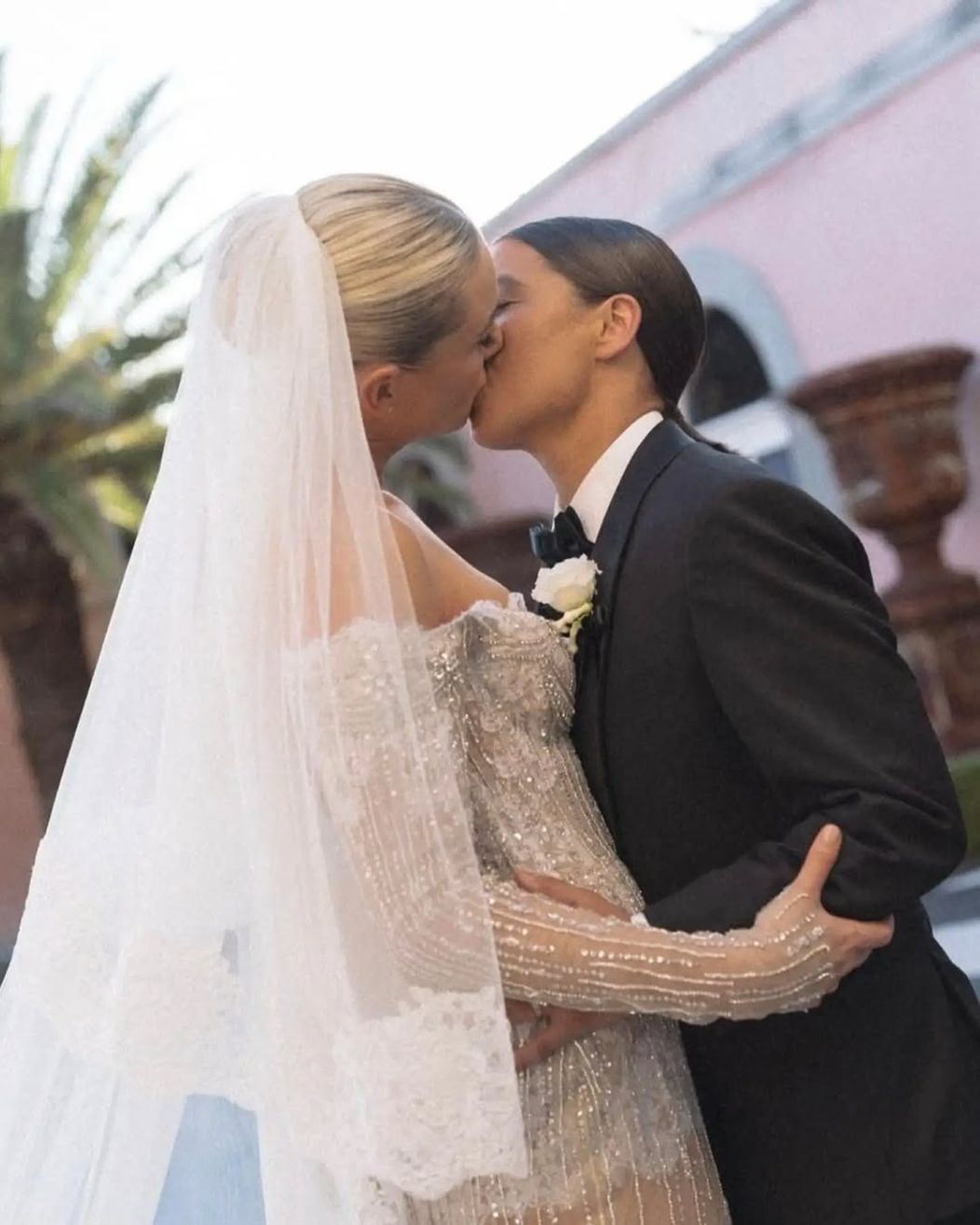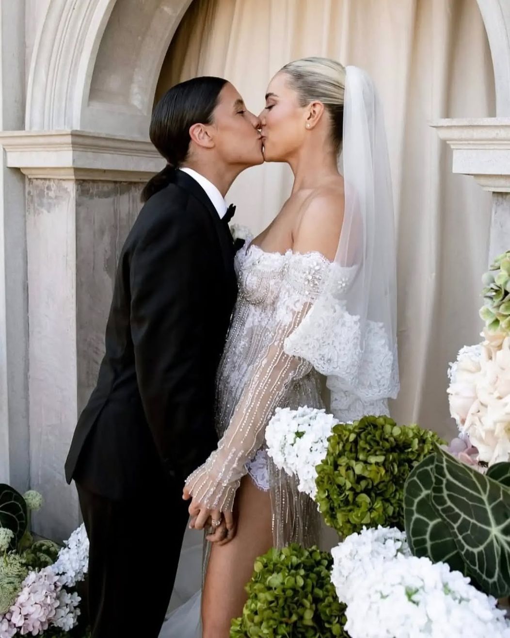 Sam Kerr și Kristie Mewis s-au căsătorit la impresionanta Dionysus Villa, din orașul natal al fotbalistei australiene, Perth. Steaua Matildas a purtat un smoking negru, accesorizat cu o foloare albă aplicată în piept, în timp ce soția ei, Kristie Mewis, a atras toate privirile într-o ținută albă spectaculoasă, un corset peste care se așeza o fustă transparentă cu detalii sclipitoare pe întreaga lungime.