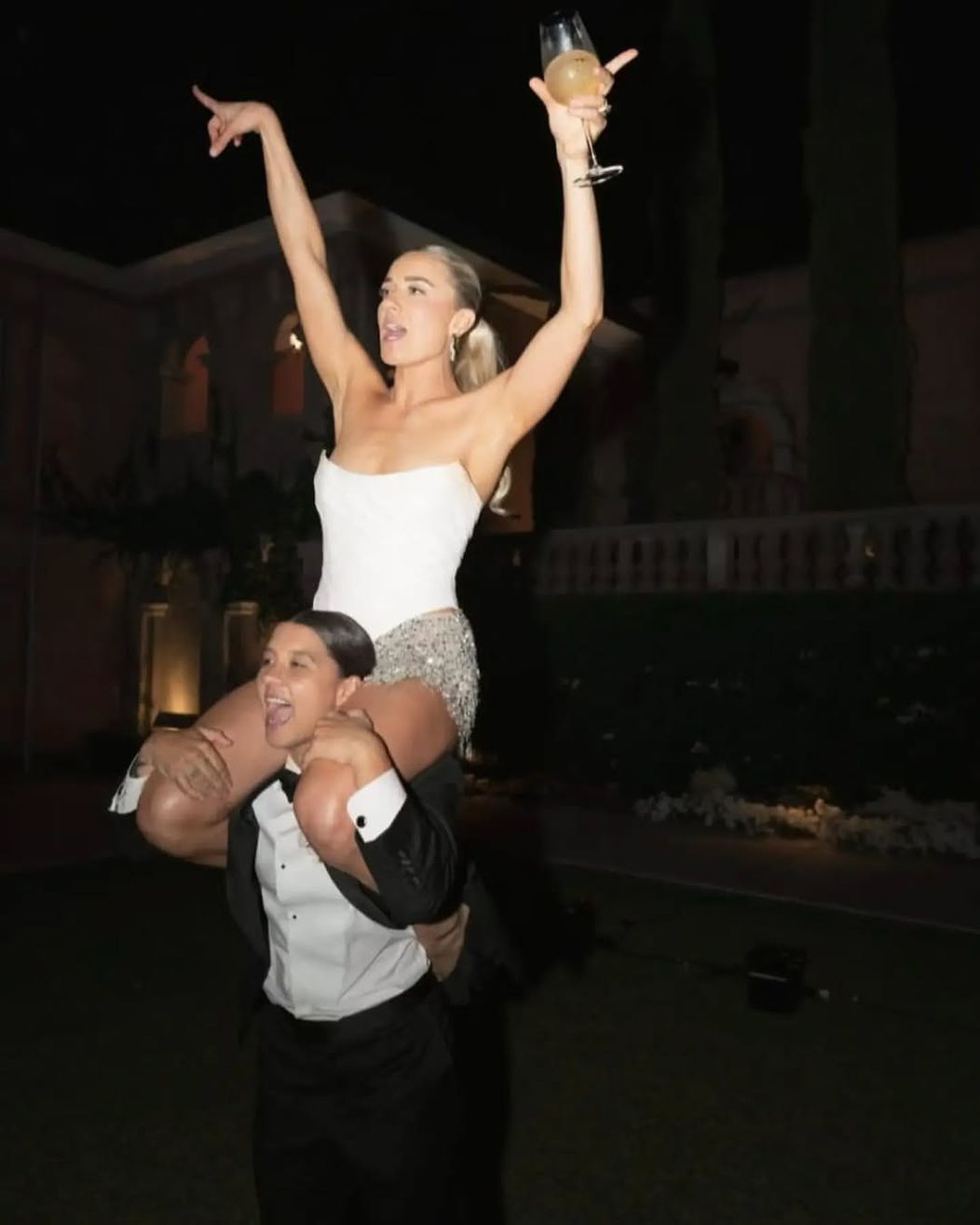 În noaptea de joi, Sam Kerr a împărtășit pe Instagram o fotografie în care sărbătorește Noul An alături de prieteni, în fața unui uriaș banner „2026”. Fotografia o surprinde pe vedetă alături de Josh Lofthouse și Tyson Hodge, purtând încă smokingul de la nuntă, semn că petrecerea a ținut până târziu.