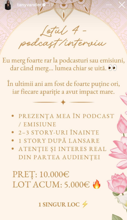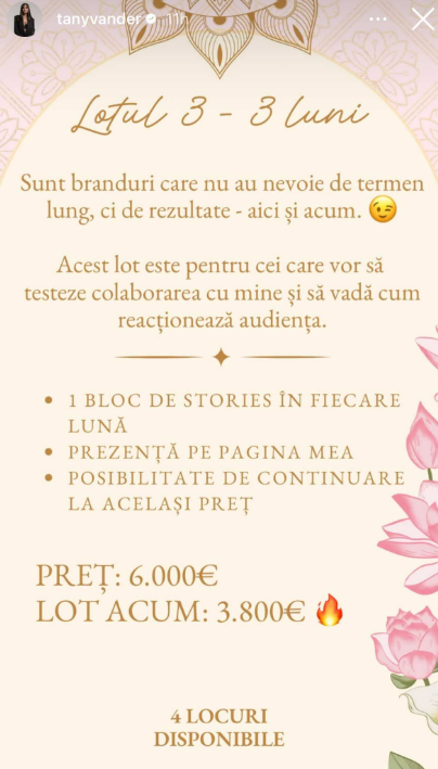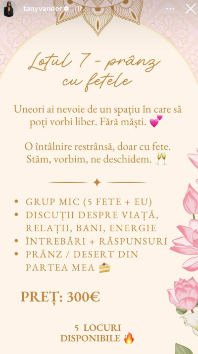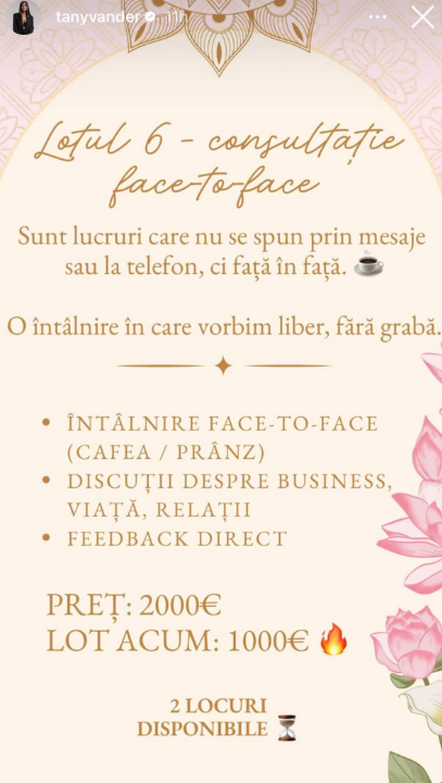 În același anunț, antreprenoarea precizează că oferă și întâlniri cu grupuri restrânse de femei, pentru un cost de 300 de euro per participare, iar dacă îți dorești „o consultație 1:1” prețul va fi de 500 €.