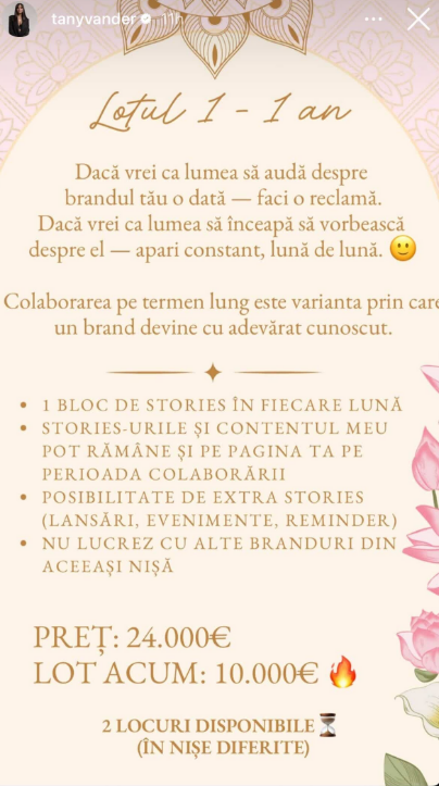 Femeia de afaceri Tany Vander a anunțat că își extinde oferta de colaborări. Potrivit unei postări publicate pe rețelele sociale, aceasta propune parteneriate pe o perioadă de un an, pentru un tarif de 24.000 de euro. De asemenea, Tany Vander menționează că este disponibilă pentru participarea la interviuri pentru o sumă de 10.000 de euro, scrie UNIMEDIA.
