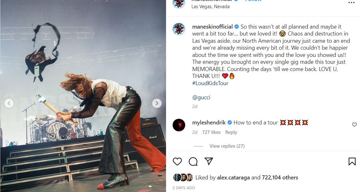 „Deci, acest lucru nu a fost deloc planificat și poate a mers puțin prea departe… dar ne-a plăcut! Lăsând deoparte haosul și distrugerea din Las Vegas, turneul nostru nord-american tocmai s-a încheiat și deja ne lipsește fiecare bucățică din el. Nu am putea fi mai fericiți decât de timpul petrecut cu voi și de dragostea pe care ne-ați arătat-o!!! Energia pe care ați adus-o la fiecare concert a făcut acest turneu să fie unul memorabil. Numărăm zilele până ne vom întoarce. Vă iubim! MULȚUMIM”, a scris trupa, pe pagina sa de Instagram.