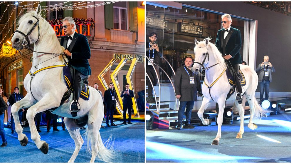 Imaginile care au făcut înconjurul lumii! Andrea Bocelli a apărut călare, într-un smoking impecabil, la Sanremo 2026