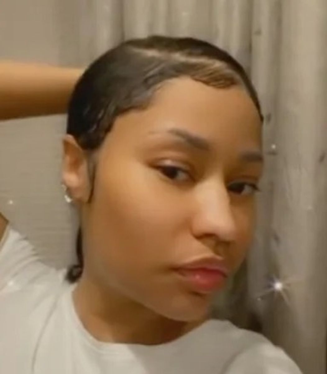 Nicki Minaj își ține adesea părul natural ascuns sub peruci spectaculoase, dar a postat ocazional imagini cu textura ei reală, fără permanent, fără extensii.