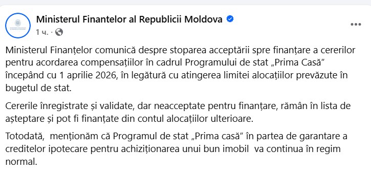 Ministerul Finanțelor anunță că, începând cu 1 aprilie 2026, cererile pentru acordarea compensațiilor din cadrul Programului „Prima Casă” nu mai pot fi depuse, din cauza epuizării alocațiilor bugetare.