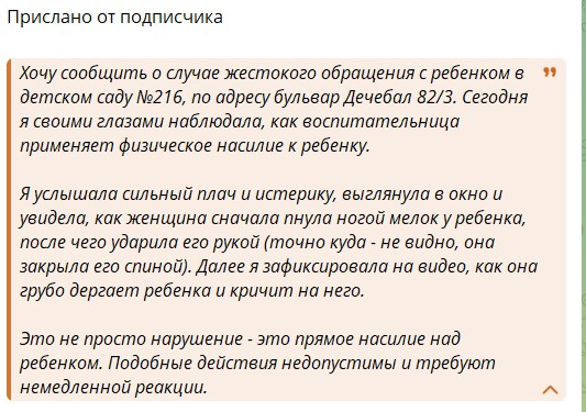 Aceasta relatează că a auzit plânsete puternice și o criză de isterie venind din curtea instituției. Privind pe fereastră, femeia susține că a observat cum educatoarea a lovit cu piciorul creta copilului, după care l-a lovit și cu mâna.