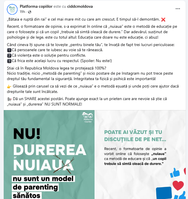 Totodată, amintesc că, în 2025, Ministerul Educației și Cercetării a lansat Platforma națională în domeniul educației parentale și promovării relațiilor pozitive între părinți și copii, creând un parteneriat solid între autorități, societatea civilă și organizațiile internaționale în domeniul educației parentale”, a scris Coroi.