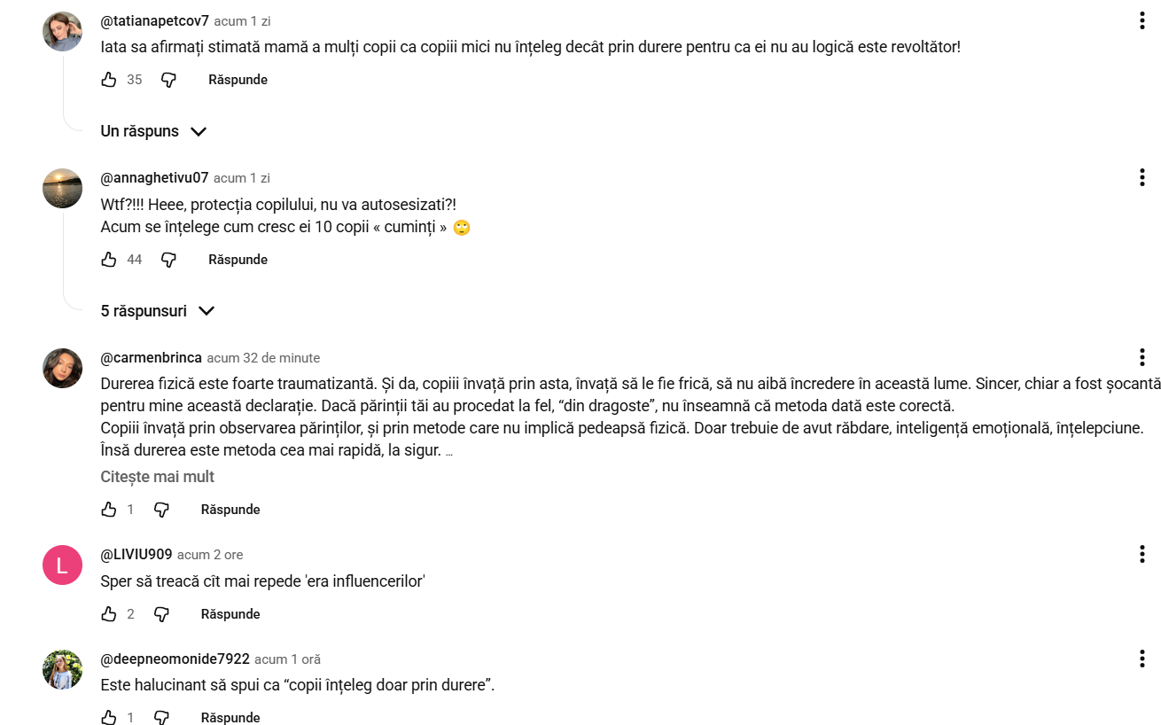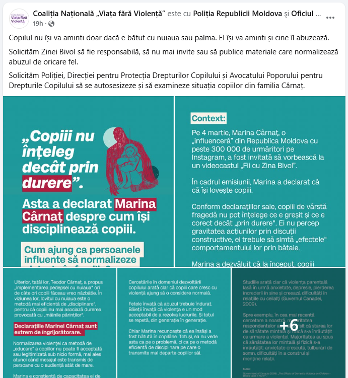 Un val de reacții a apărut pe internet după ce bloggerița Marina Cârnaț a declarat, într-un podcast realizat de Zinaida Bivol, că își pedepsește copiii fizic, menționând că aceștia nu pot înțelege ce este corect și ce este greșit decât „prin durere”. În acest context, Avocatul Copilului, Vasile Coroi, a anunțat că s-a autosesizat pe acest caz, scrie UNIMEDIA.