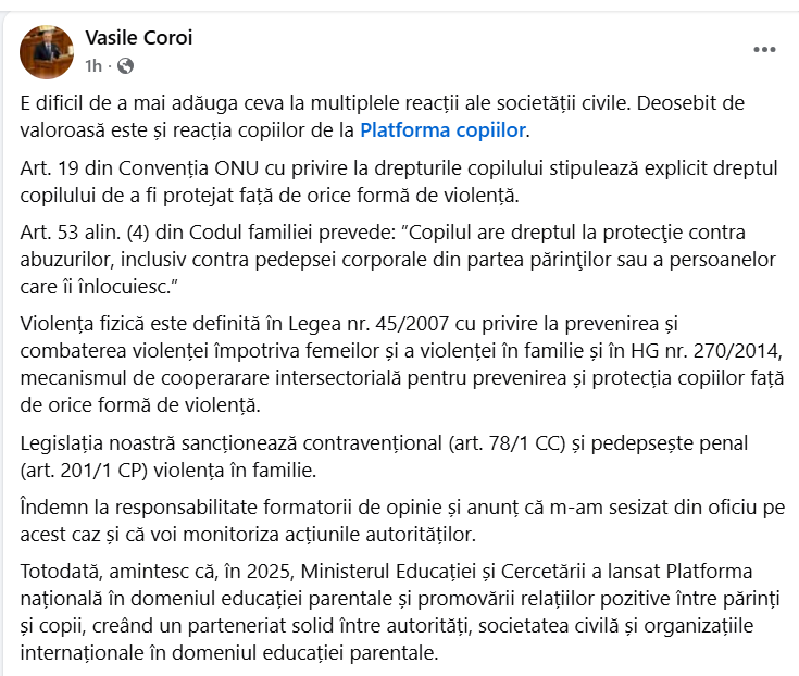„E dificil de a mai adăuga ceva la multiplele reacții ale societății civile. Deosebit de valoroasă este și reacția copiilor de la Platforma copiilor.