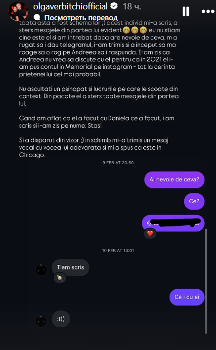 „Din sursele persoanelor care au fost și sunt aproape de Iuliana, am înțeles că ea public nu o să mă atingă și public nu o să zică numele meu, pentru că de mine îi este cel mai mare frică (…) Andreea mi-a scris de mai multe ori și a spus că nu înțelege de ce eu tac (…) Mi-a zis el dacă am ceva împotriva Iulianei, că el vrea să construiască un canal și că vrea să posteze public despre ea, eu i-am spus că nu am niciun video, decât acel video în care vorbea urât la 13 ani cu acea fetiță (…) Mi-a trimis un clip, un screenshot în care îmi arată că a închis contul părinților Iulianei Beregoi (…) Nu am picat-o pe asta, pentru că știam că sunt prieteni”, a spus Olga Verbițchi, pe Instagram.
